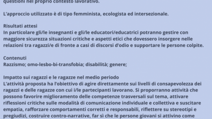 L’‘effetto farfalla’ si basa sull’idea che piccole variazioni nelle condizioni iniziali producano grandi variazioni nel comportamento a lungo termine di un sistema. Ed è proprio questo che il progetto Effetto Farfalla si pone l’obiettivo di perseguire, proponendosi di rafforzare nellз giovanз dagli 11 ai 19 anni comportamenti positivi per contrastare le discriminazioni e promuovere il rispetto di tutte le diversità, fornendo gli strumenti per comprendere cos’è la discriminazione, le sue forme e la loro intersezionalità, come il Web possa amplificarne l’impatto sulla vita delle persone e incoraggiando a un impegno attivo per supportare le persone che ne sono vittima, con l’obiettivo di costruire una società capace di isolare e depotenziare questi fenomeni.